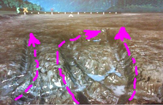 パープルで示した線が走った跡の轍(わだち)です。